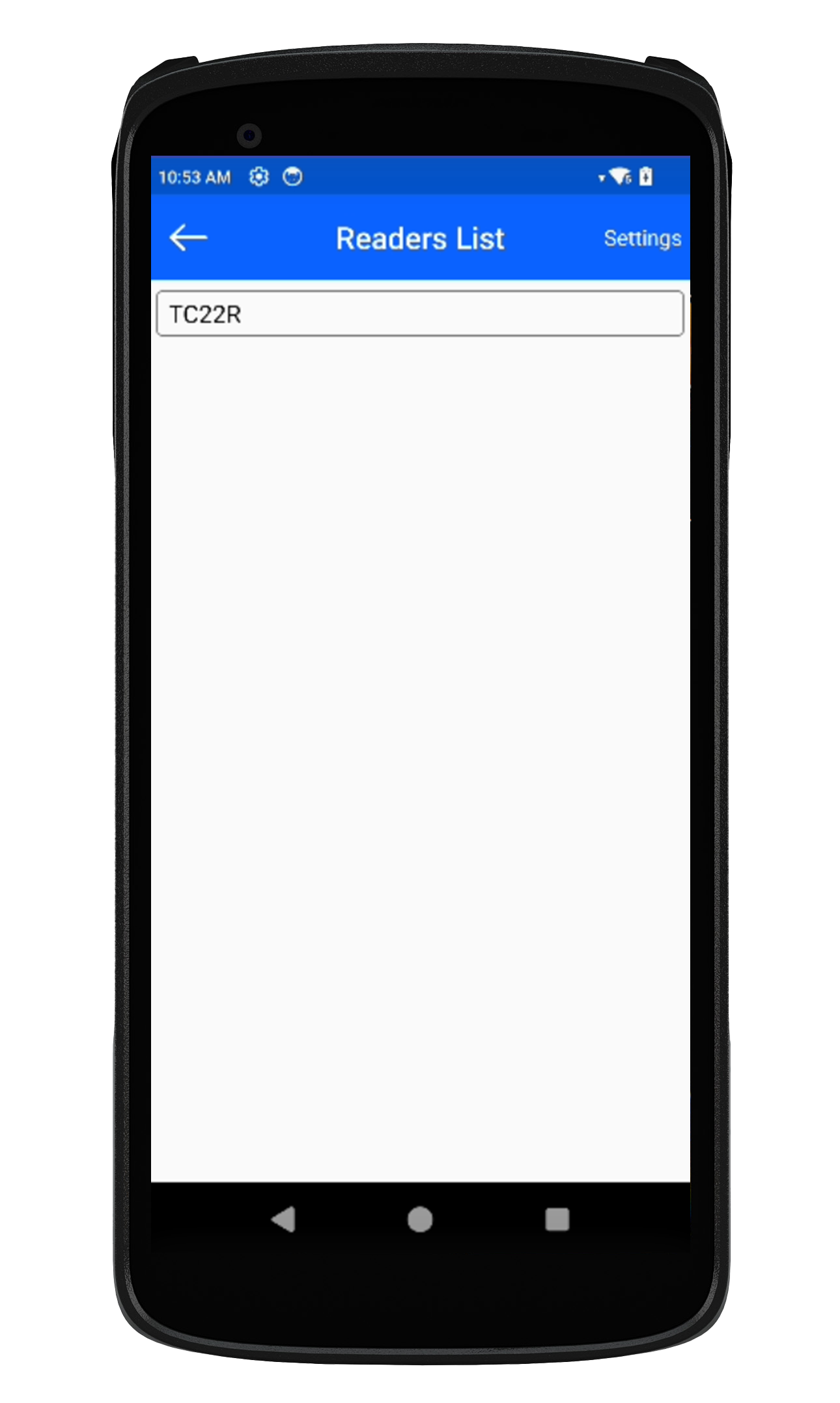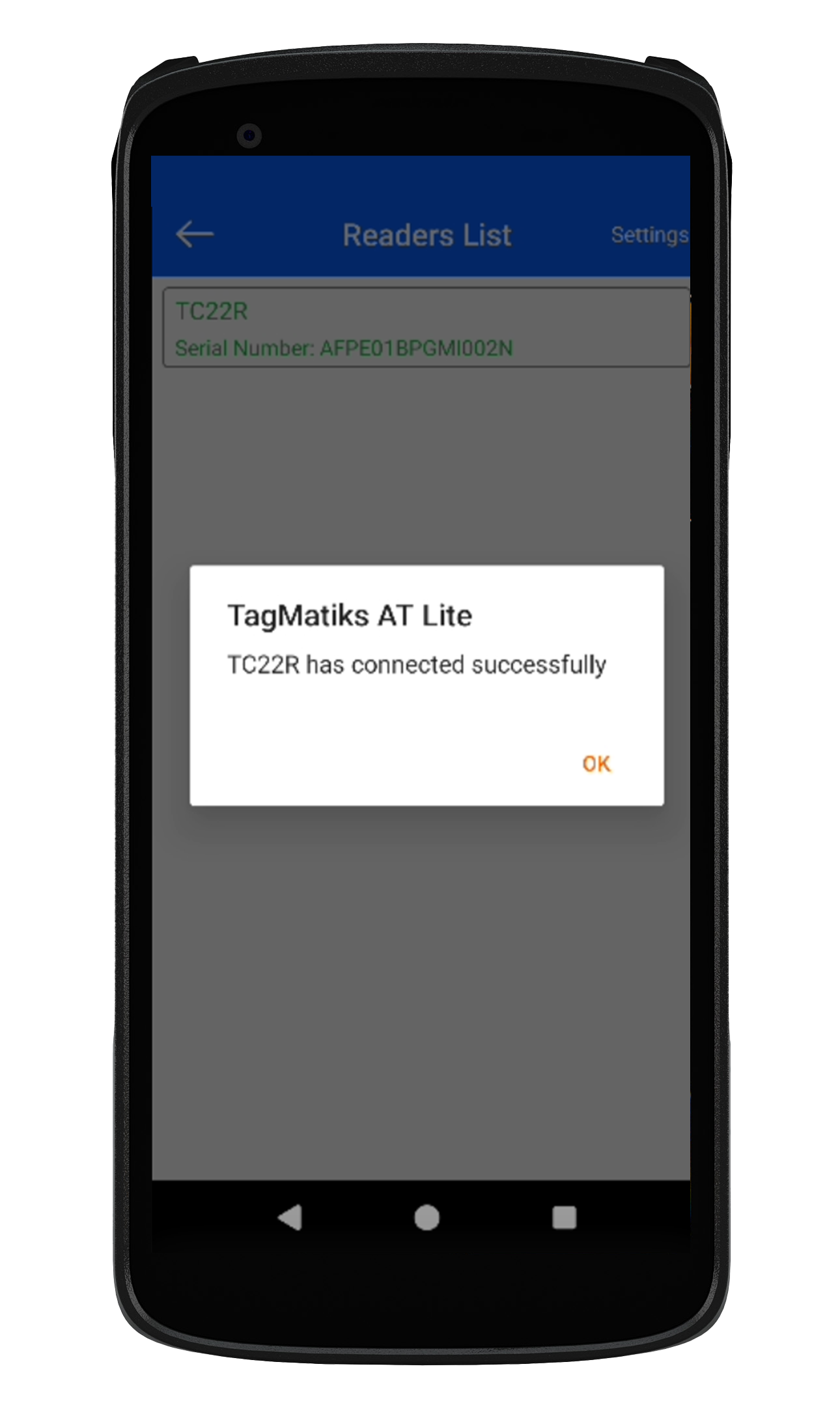 4. Tap on the “TC22R” to successfully make the connection between the TagMatiks AT Lite application & Zebra TC22R Reader. As shown in Fig 0.4.