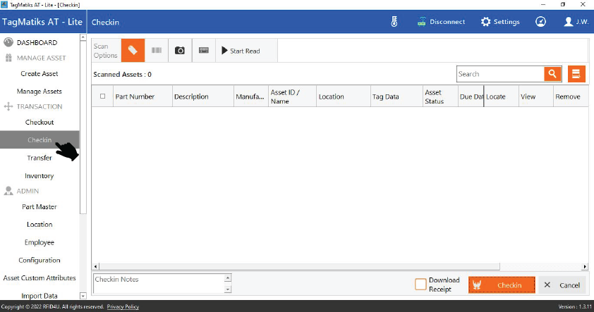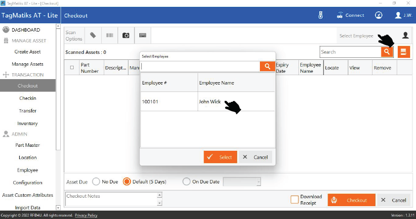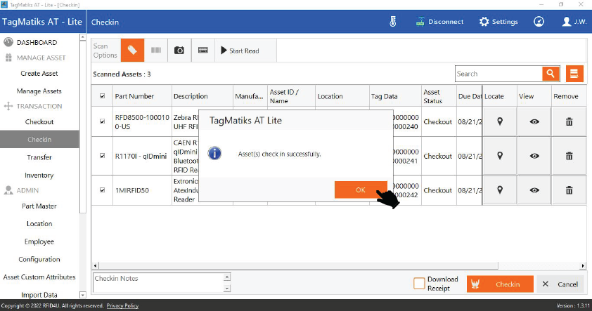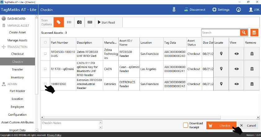 3. Click on checkbox to select the asset for checkin and click on the “Checkin” button to complete the transaction.