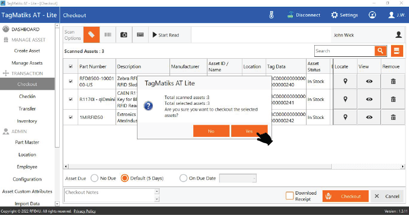 6. A popup window will open in which the total scanned and total selected asset will populate, if you are sure to checkout the selected asset click on “Yes” button.