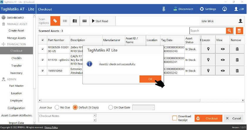 5. A new popup will open stating that “Asset check in successfully”, click on the “Ok” button to close the popup.