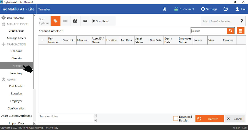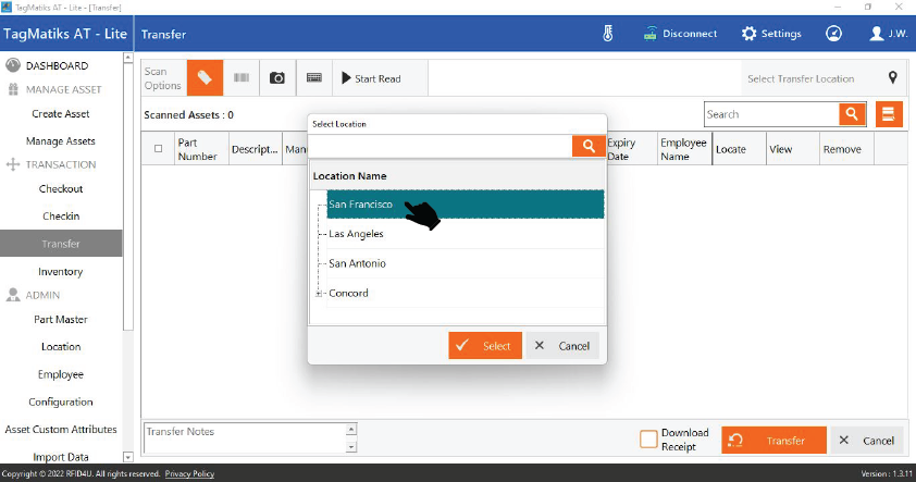 2. Click on the “Transfer” button to start the transaction and click on the “Select Transfer Location” button from the top right-hand side of the application to select the Location to transfer the asset.