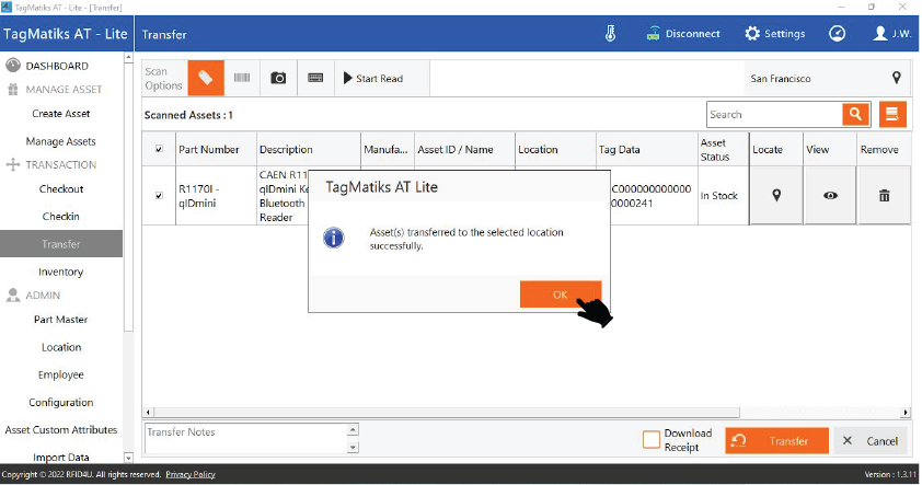 7. A new window will open stating that “Asset transferred to the selected location successfully”, click on “OK” to close the popup and go to the dashboard.