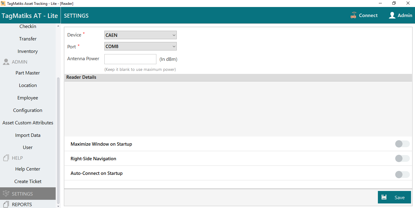 After Selection of the Reader Click “Connect” then Save.