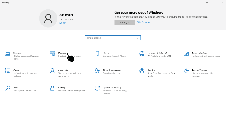 From the Start Menu, select Settings. Then in the PC Settings window, select Devices.