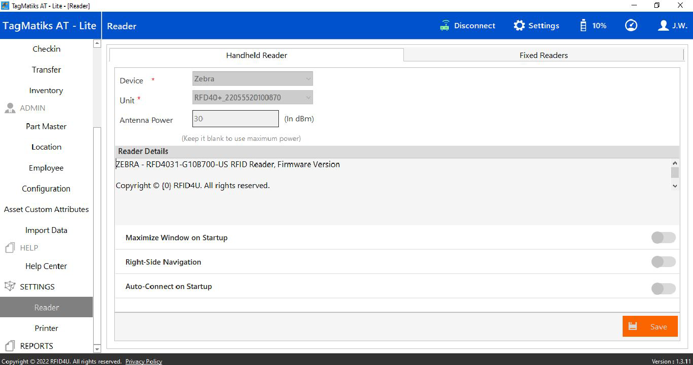 9. Select Zebra from the Device dropdown option and in the Unit option select "RFD40+ 22055520100870". Click on "Save" and then on Connect Button to make a successful connection between the application and the reader.