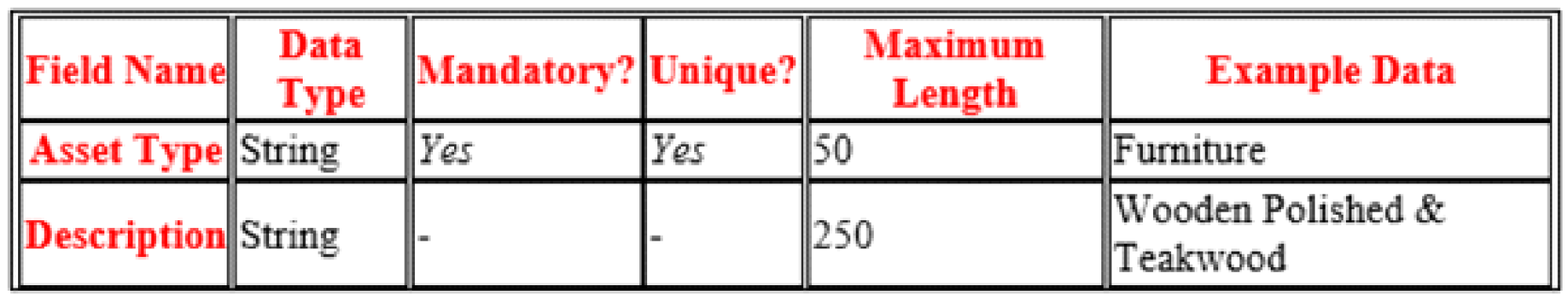 There are certain rules of formatting of the asset data that must be followed, please follow the data formatting as mentioned in below charts.