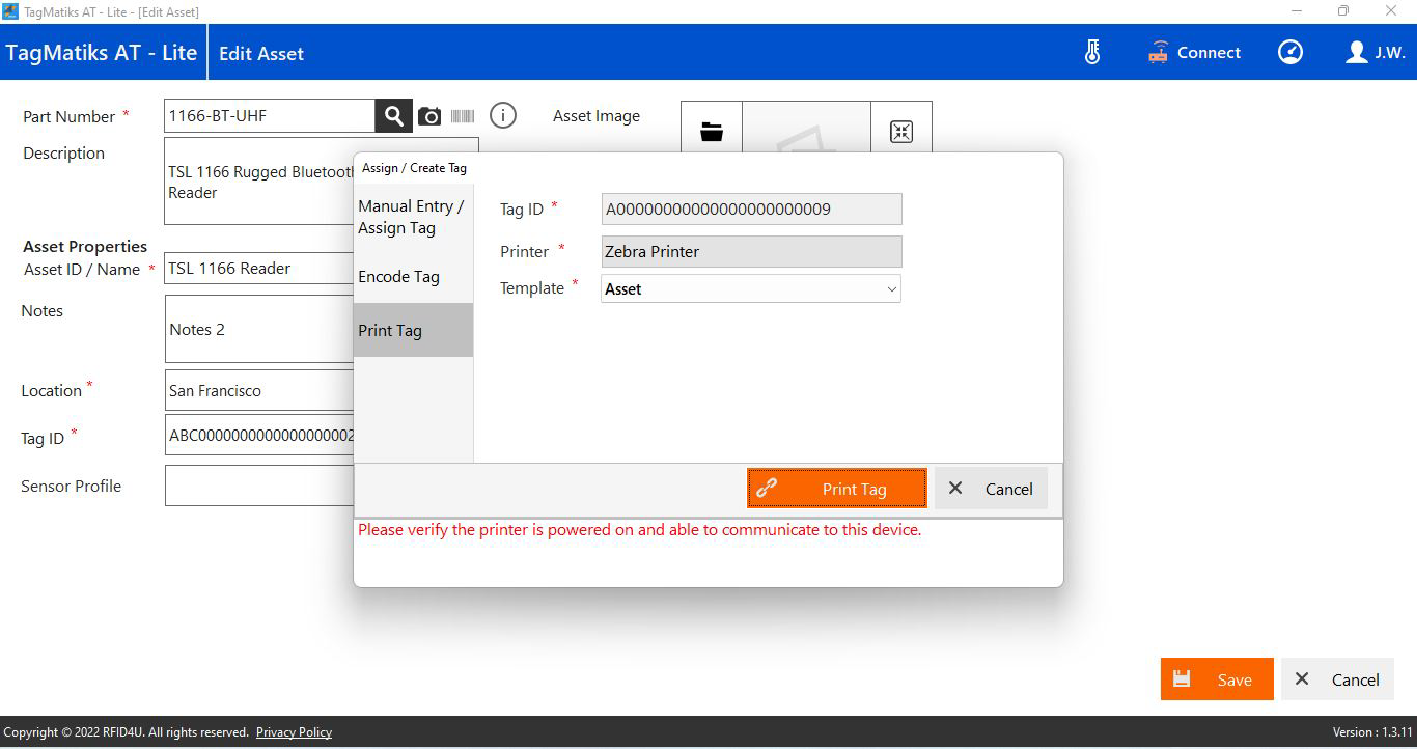 If you are getting the error “Please verify the printer is powered on and able to communicate to this device” In TagMatiks AT Lite as shown in image below.