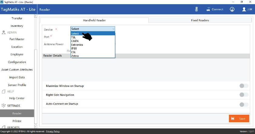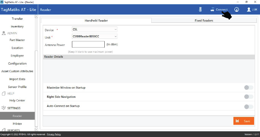 4. To make the connection with CSL reader; press “Reader” button from settings menu- on the left-hand side of application (Highlighted in red color).