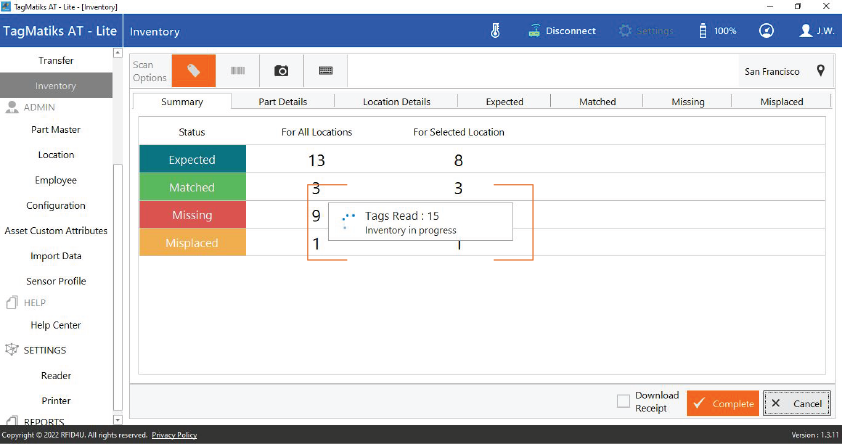 6. To read the RFID tags from CS108 reader; press “Inventory” button as indicated in image below on the left-hand side of application, and select the location as shown right hand side of application in image below.