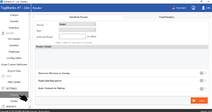 2. On the top right side of the application, you can check the reader’s connection status; as shown below. If it is not connected with any RFID reader; it will show as “Connect”. Refer the image below.