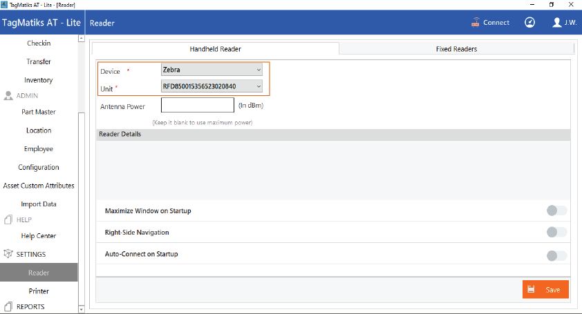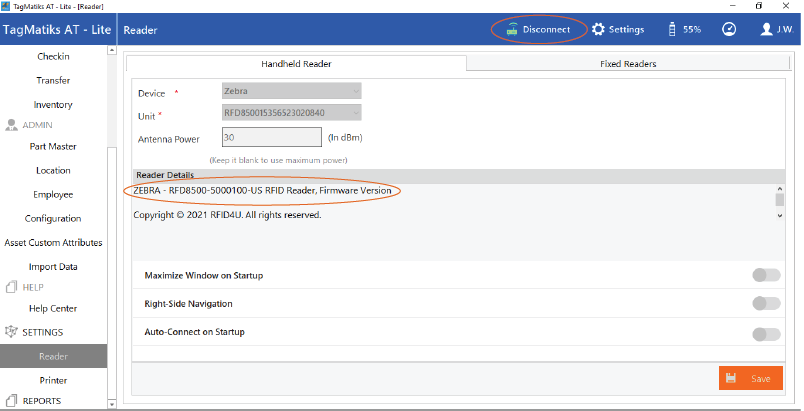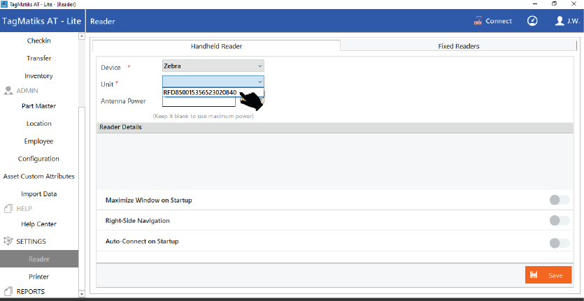 2. To make the connection with the RFD8500 reader, click on the “Reader” button.
