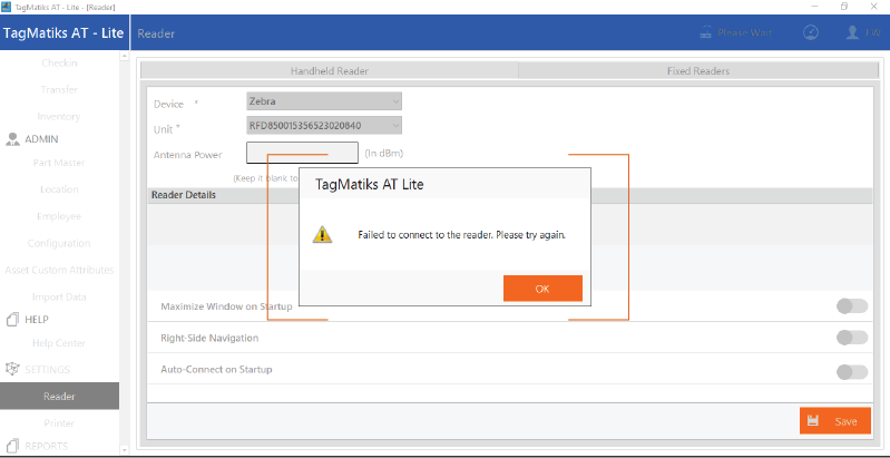 4. A new popup will open stating that “Failed to connect to the reader, please try again.