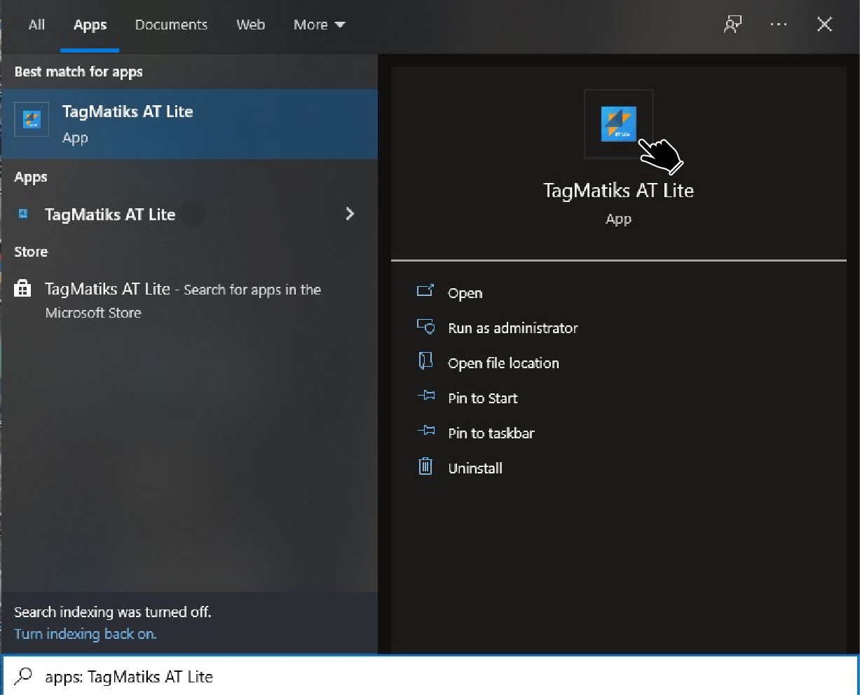 After successful installation of TagMatiks AT Lite application, please open the Start menu and click on the “TagMatiks AT Lite” icon. Refer the image below: